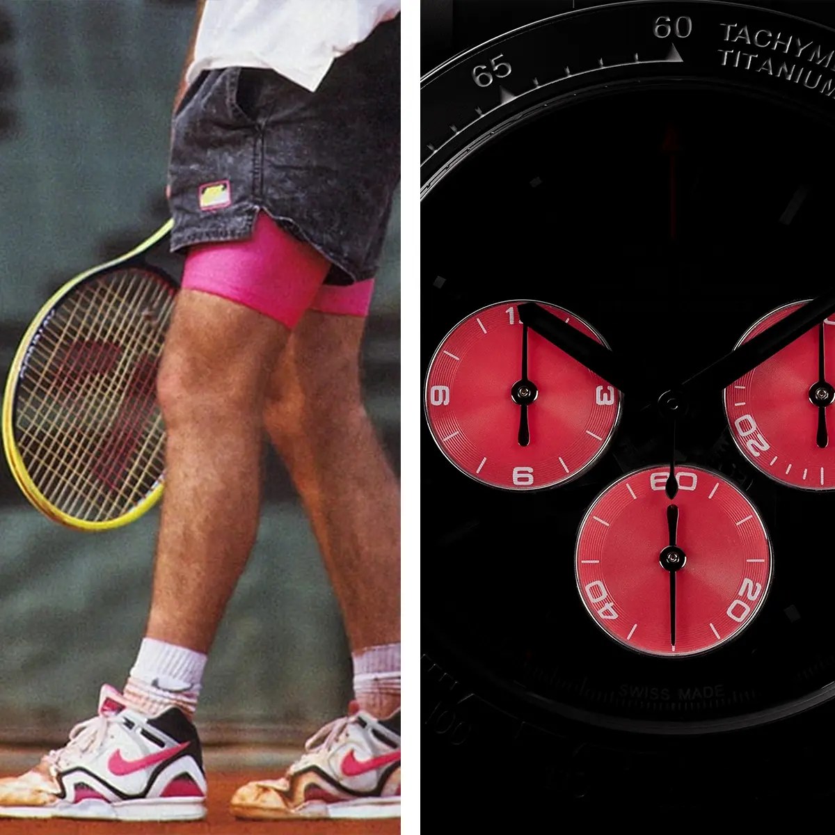 Agassi naturally gravitated toward incandescent orange-pink and deep black colors that are unmistakably his own. They evoke his legendary sneakers, marked by lava and fire, and recall a formative chapter of his career: raw energy on the court, a bold aesthetic, and an uncompromising style.