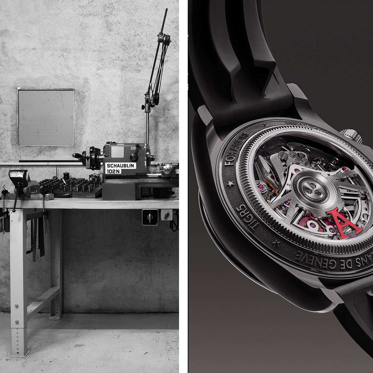 Inspired by chronographs from the 1980s and 90s, the 40mm case features polished and chamfered lugs that bring light, contrast and structure, just as Andre requested, while paying homage to Jean-Pierre Scherrer’s style. The case was machined using a Schaublin 102 lathe, a 1950s machine famed for its legendary precision.