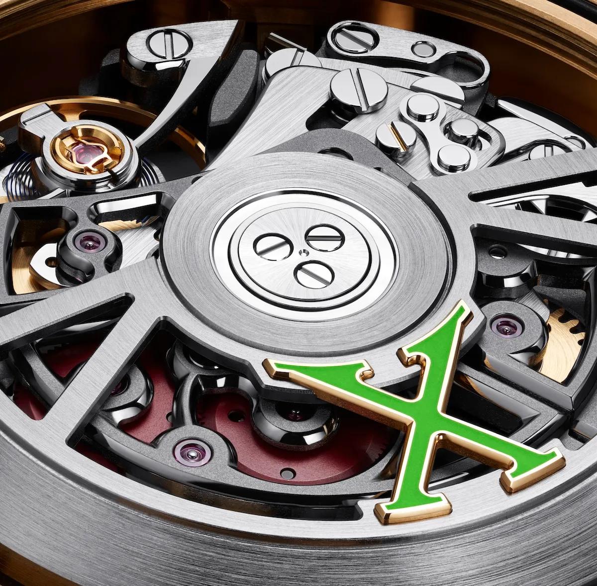 The movement is skeletonized, beveled, and hand-satin-finished, and treated with an anthracite treatment.