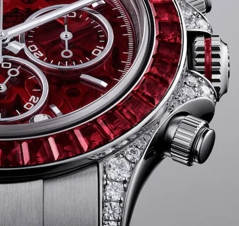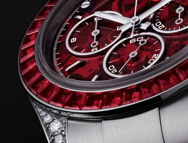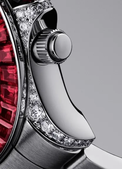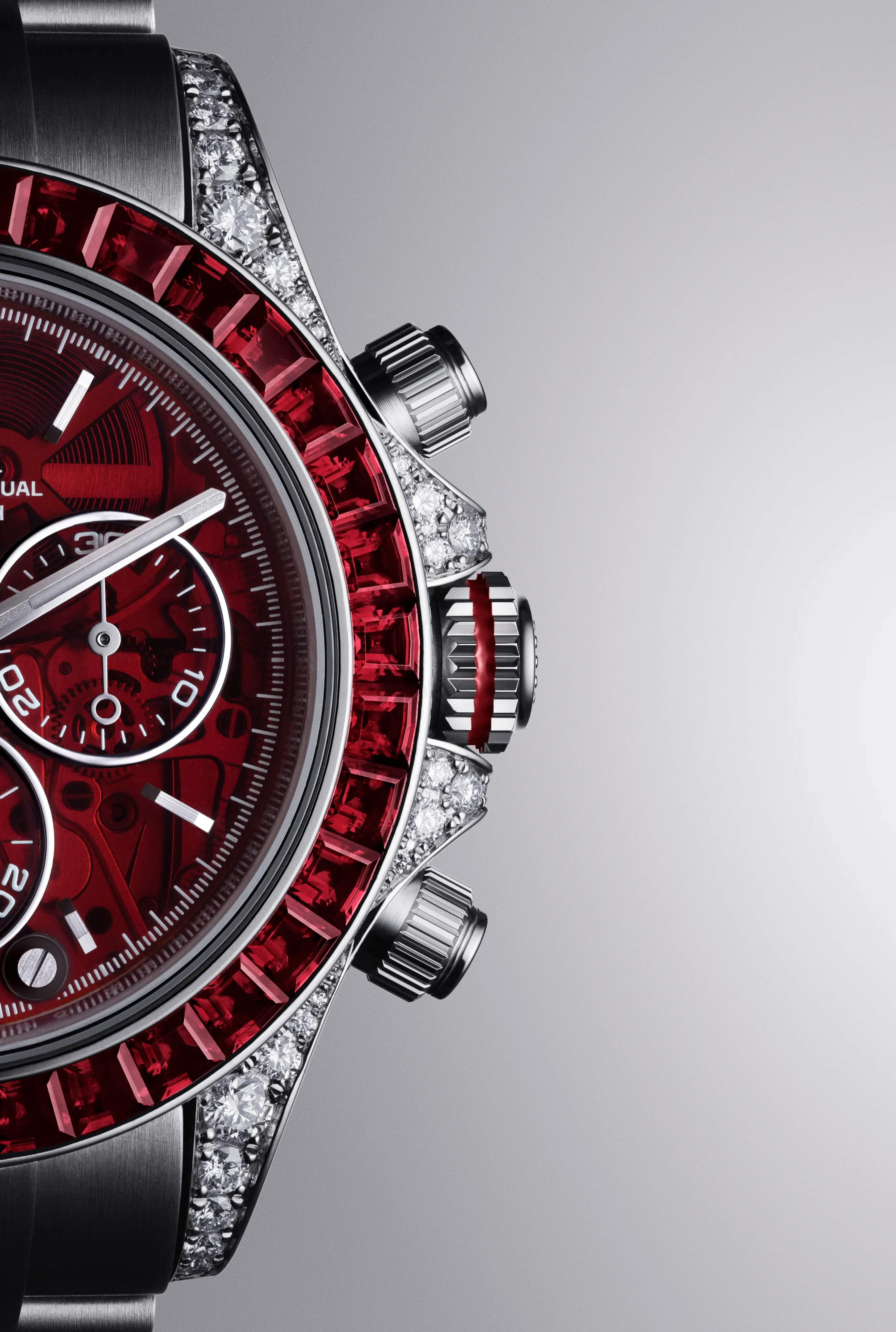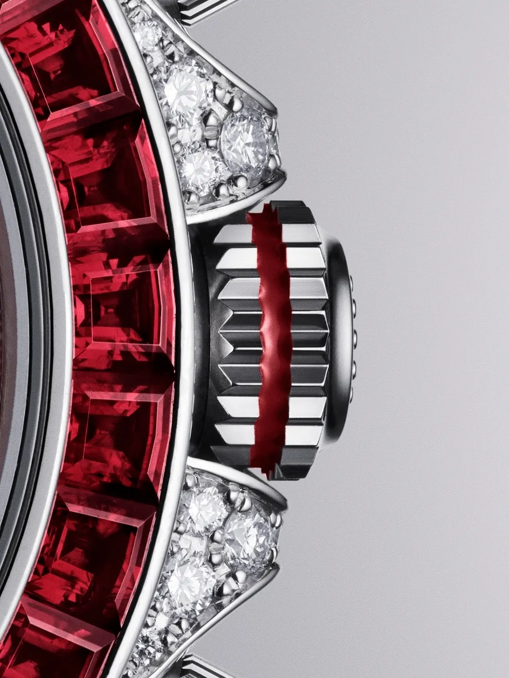 Les 36 rubis ont tous été sélectionnés sans aucune inclusion visible même sous une loupe grossissante 10 fois. Une pureté exceptionnelle d’autant plus rare que les rubis présentent presque toujours des inclusions. Le défi ne s’est pas arrêté là, l’exigence de qualité résidant aussi dans l’intégration harmonieuse des pierres dans la lunette. Chaque rubis a été calibré au centième de millimètre pour garantir une continuité parfaite des lignes, des hauteurs de tables ainsi qu’une uniformité de couleur et de brillance de toutes les pierres.