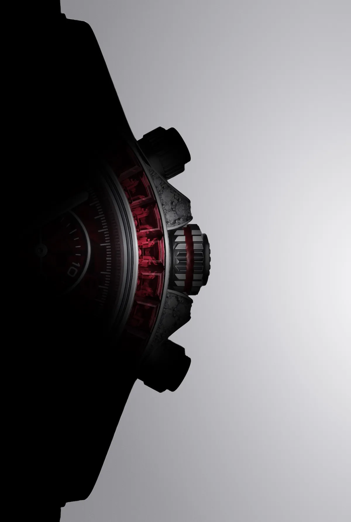 Réaliser un tour de montre entièrement serti de rubis de haute qualité a été un vrai défi technique et artistique. Nous avons donc fait appel aux meilleurs gemmologues, marchands et négociants à travers le monde. Ce projet a nécessité une maîtrise extrême de chaque étape de production, depuis la sélection des pierres jusqu’au sertissage final, tout en tenant compte des spécificités physiques et esthétiques de ce matériau précieux. .