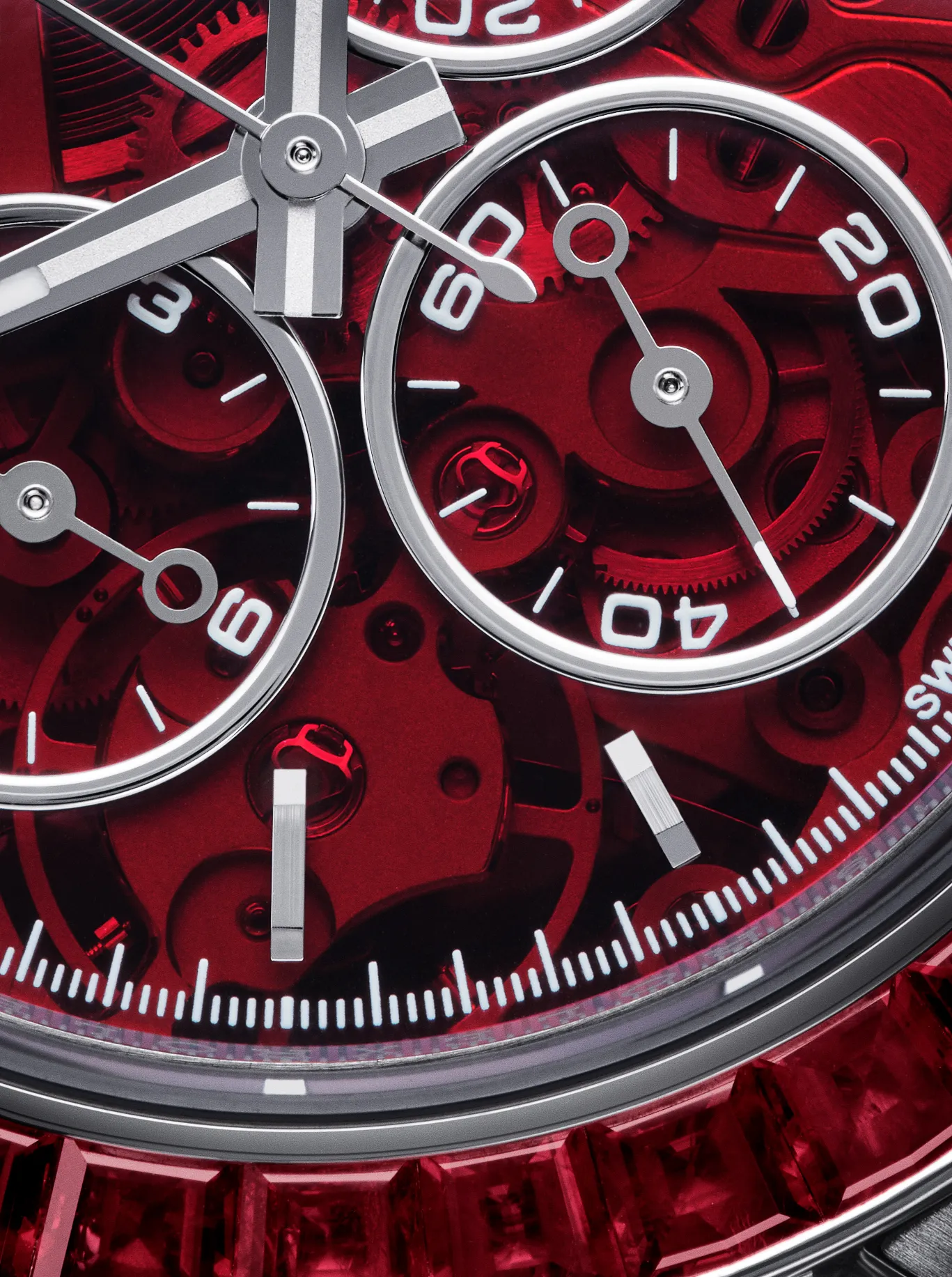 Poussés par le souhait de notre client, nous avons relevé un défi inédit : créer pour la première fois un cadran en saphir rouge.