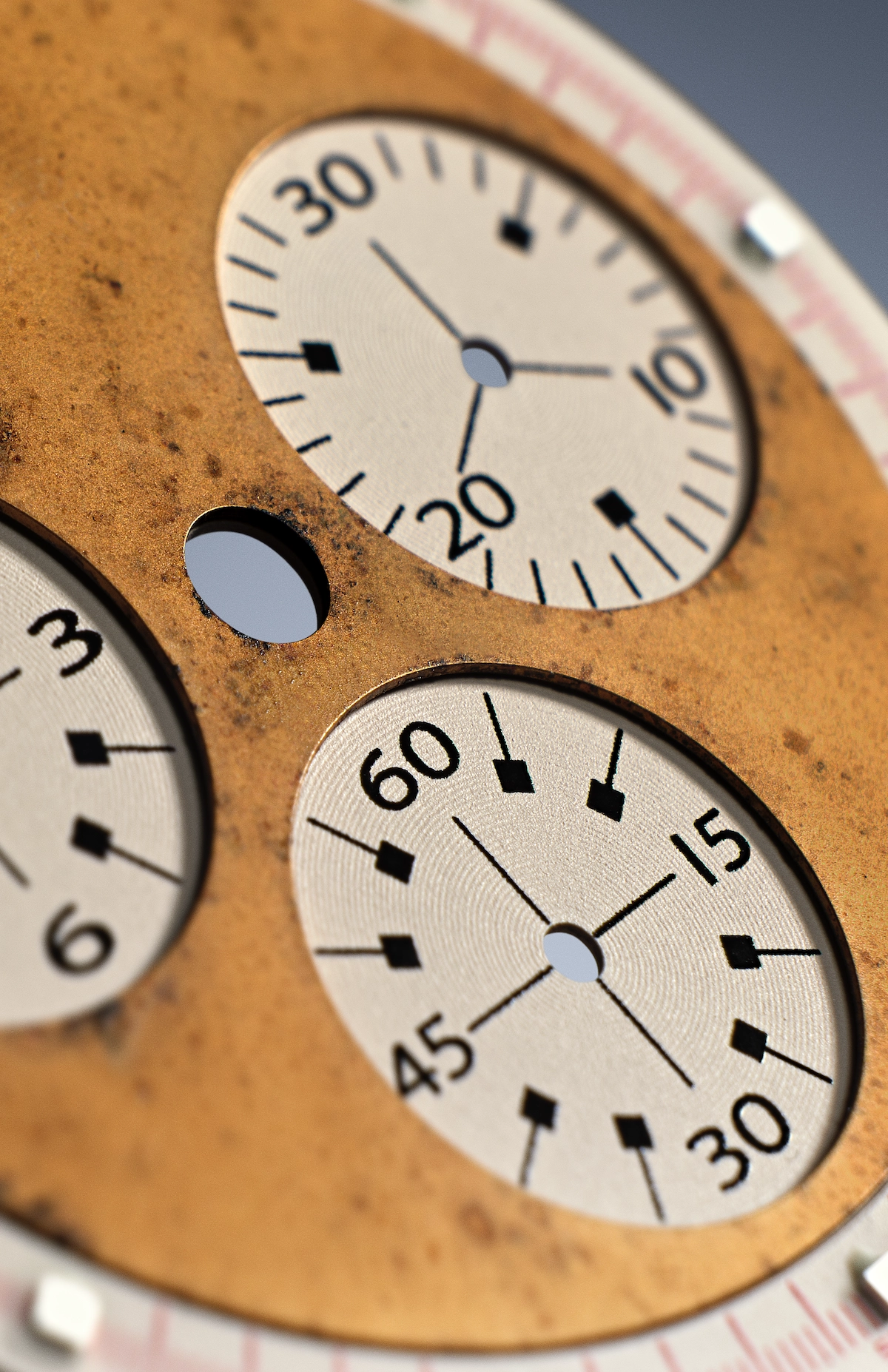 Première modification majeure, le cadran a été intégralement repensé. Tout en respectant l’esthétique bicolore et les détails du style Paul Newman, Alexander Kraft a souhaité conférer au cadran un aspect unique: patiné, rappelant l’oxydation naturelle de matières marquées par le temps et l’humidité.