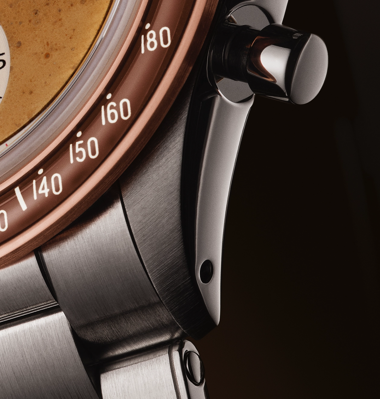 Comme la patine qui magnifie les matériaux de la voiture, la lunette en cuivre de la montre évolue avec le temps. Les artisans l’ont créé en cuivre, pour garder une unité avec le cadran ce qui lui permet d’obtenir une patine qui évoluera à travers le temps et qui reflète sa personnalité.