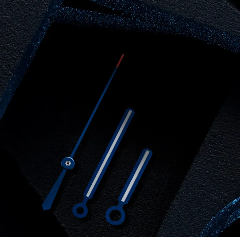 La couleur Ice blue, les index en traitement PVD bleu et les subtiles touches de rouge contrastent avec le mouvement au fini sablé.